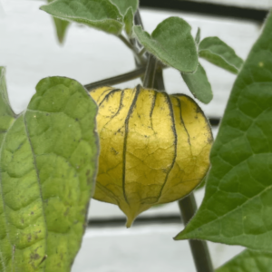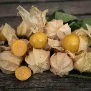 Ananaskirsebær med store bær. Under de lanternelignende hylstre gemmer der sig sød-syrlige, orange frugter med et strejf af tropisk aroma.