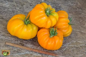 Tomaterne er store, faste og kødfyldte - lidt fladtrykte og kan være både boblede og ribbede. Tomaterne har et utroligt smukt farvespil med gul/rød som dominerende farver