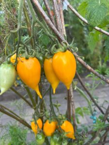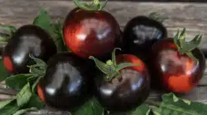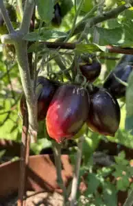 omaterne er aflange med en lille spids. Tomaterne er mørke af anthocyaniner på solsiden. På den side, hvor solen ikke rammer har tomaterne er smukt farvespil i pink, orange og gyldne farver.