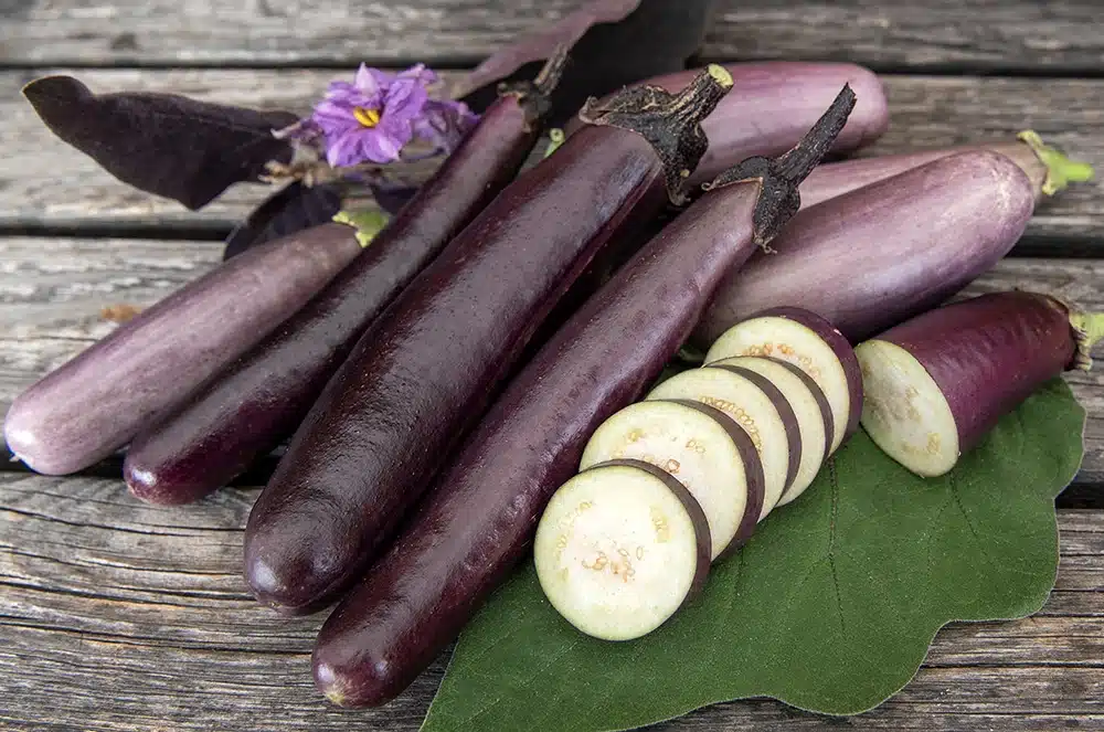 Lys lilla til purpurfarvede, aflange frugter på ca. 15 cm i klynger. Kraftige planter med mosgrønt til mørk lilla løv. Jo mere sol de får, jo stærkere bliver farven. Fast, hvidt frugtkød med fin smag, helt uden bitterhed. Rigt ydende sort til bede eller krukker på en varm, beskyttet vokseplads.