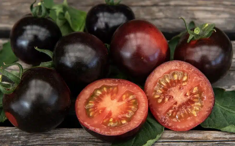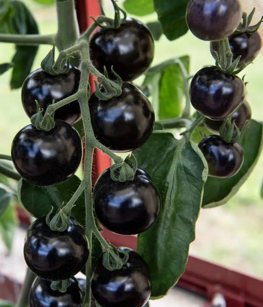Solanum lycopersicum – Iøjnefaldende, helt særlig tomat, hvis overflade er næsten uvirkeligt blank og sort med grønne striber, og bliver murstensrøde ved fuld modenhed. Runde frugter på ca. 50 gram med gennemfarvet, saftigt frugtkød og delikat smag. Meget dekorativ med sin unikke farve. Dyrkes i drivhus eller på en varm, beskyttet plads udendørs.