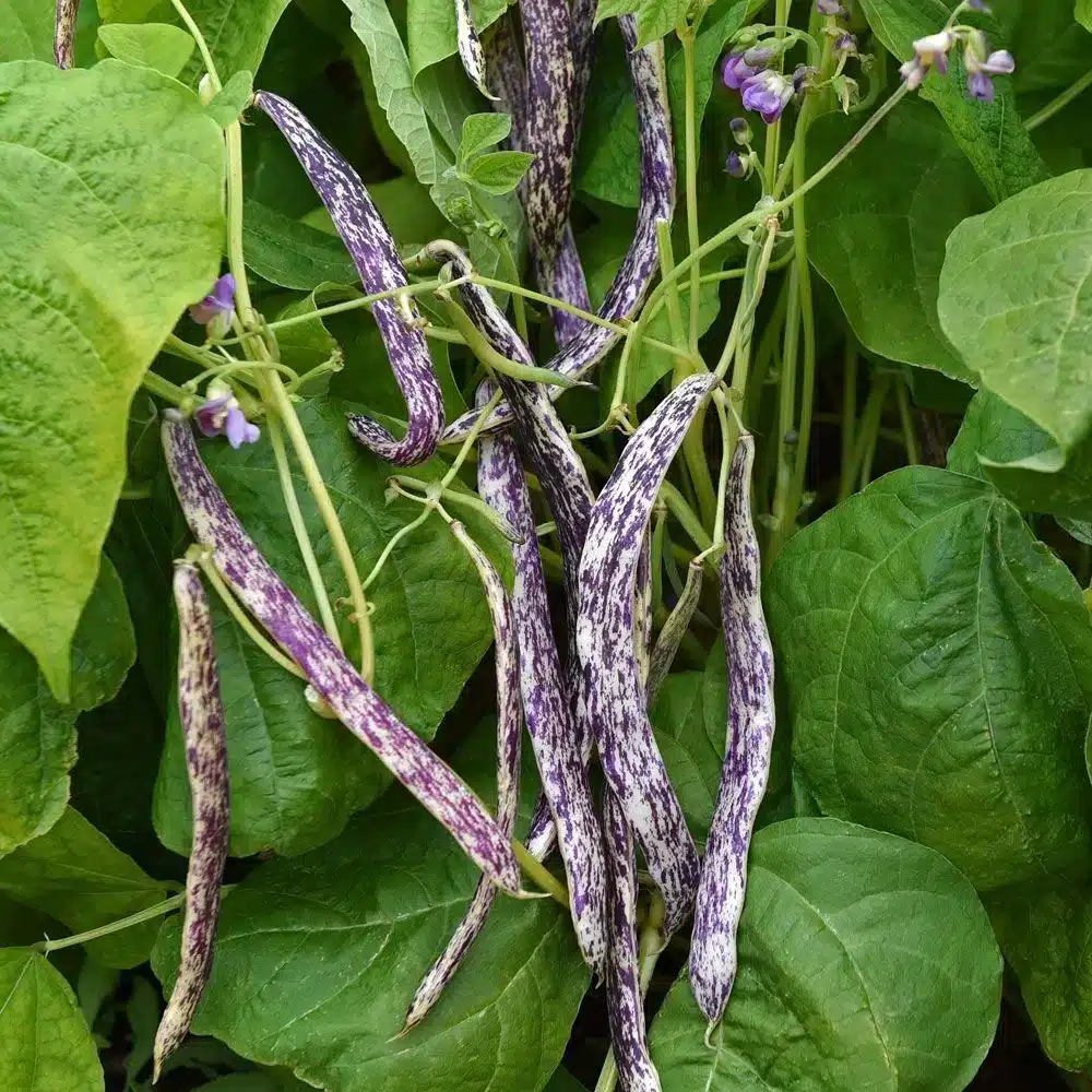 Phaseolus vulgaris (Vaxböna-gr.) – Dekorativ lavtvoksende buskbønne med 15-20 cm lange, flade bælge, cremegul med lilla striber. Ekstremt sprød, fin kvalitet. Højproducerende over hele landet. Fremragende til frysning