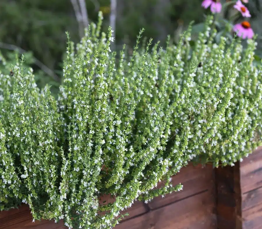 Traditionel krydderurt. Halvbusk med masser af hvide blomsterspir. Friske og tørrede kviste bruges som krydderi i salater og supper. Fin til tiltrækning af bestøvende sommerfugle, bier og humlebier. Kan med fordel dyrkes som hæk- eller bedplante i urtehaven eller staudebedet. Kan også dyrkes indendørs i krukker hele året.