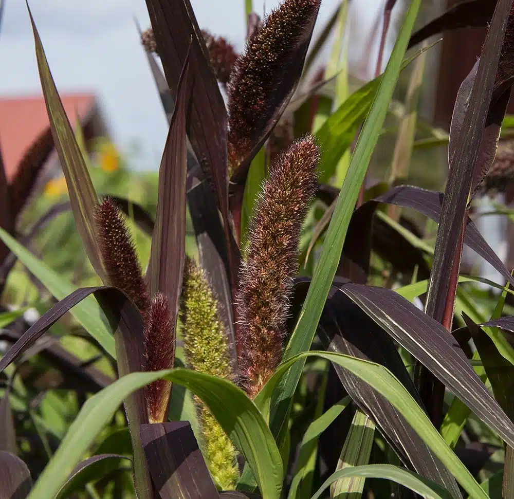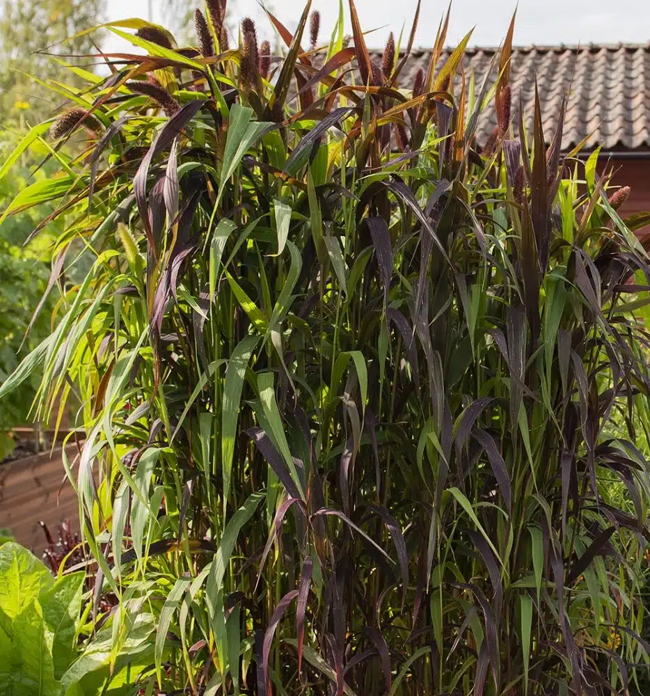 Statelig prydgræs med mørke, rødbrune, store, børstelignende kolber. Tætte tuer af brede, lancetformede blade, der gradvist går fra lys limegrøn til dyb vinrød. En pryd for blomsterbede og større krukker