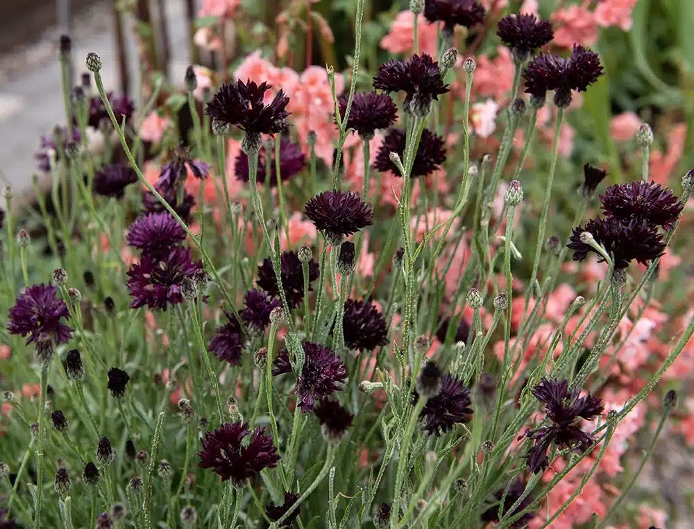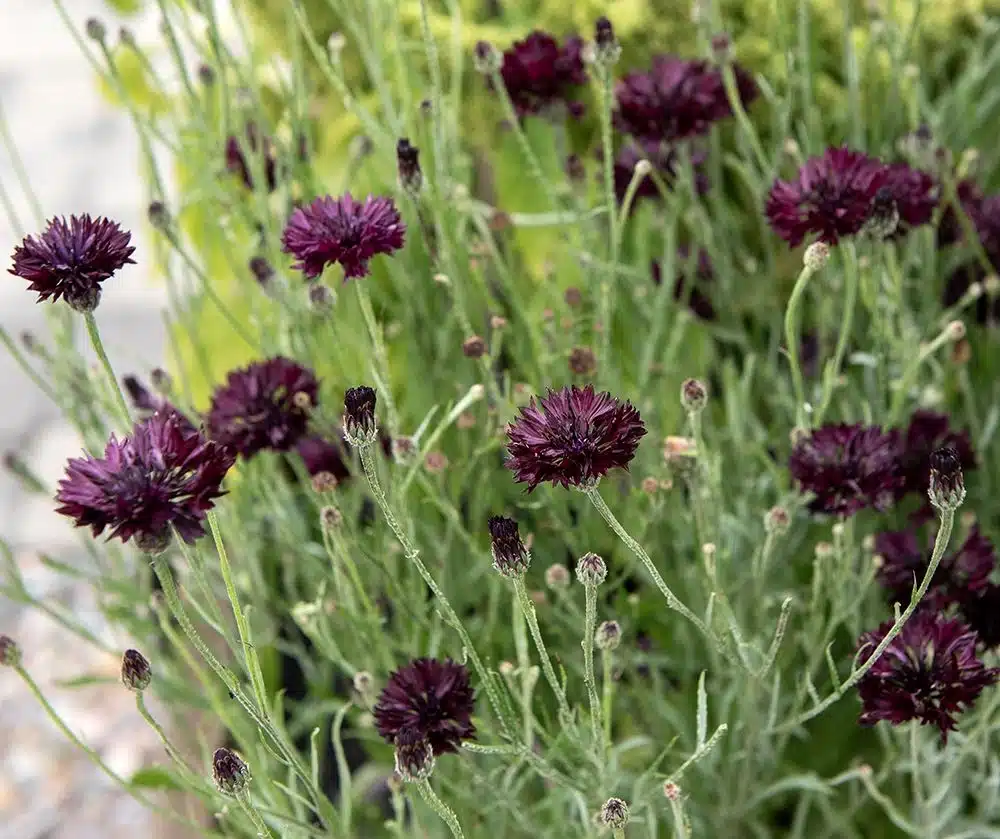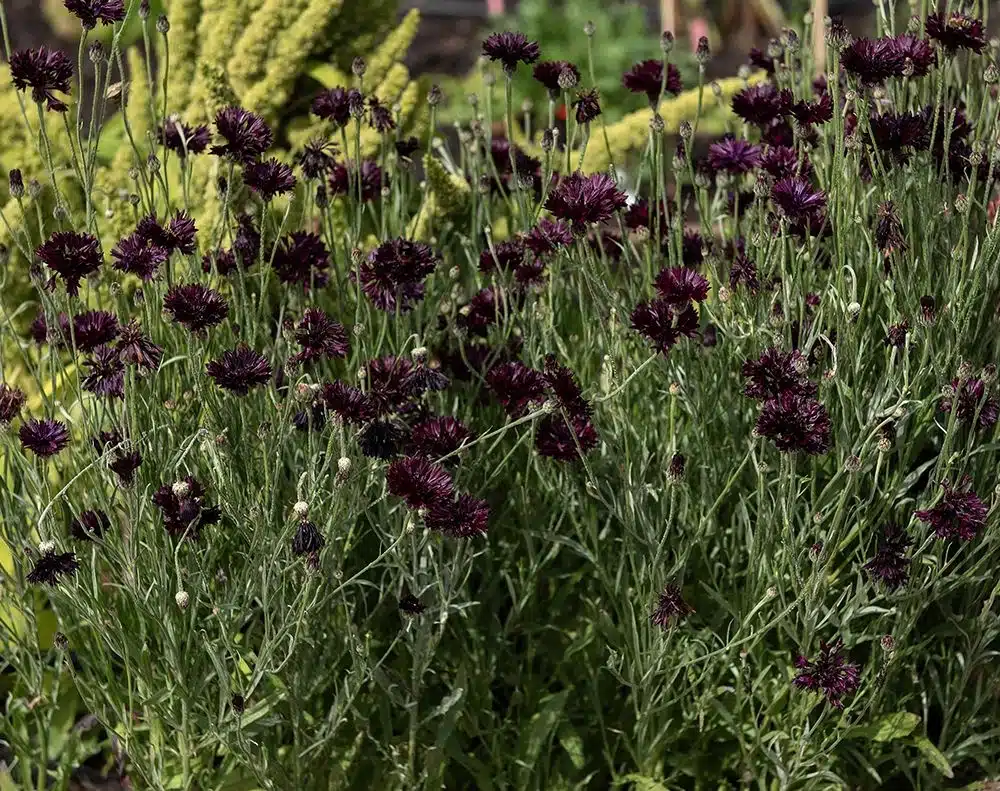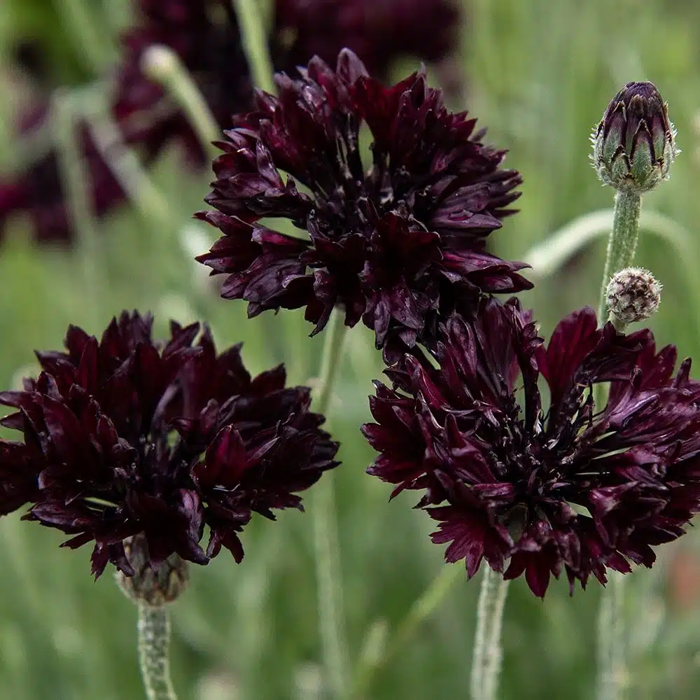 Fyldt kornblomst i mørk purpurrød. Kompakte blomsterkurve på robuste stilke. Fin i sommerbede og buketter. Kan også tørres.