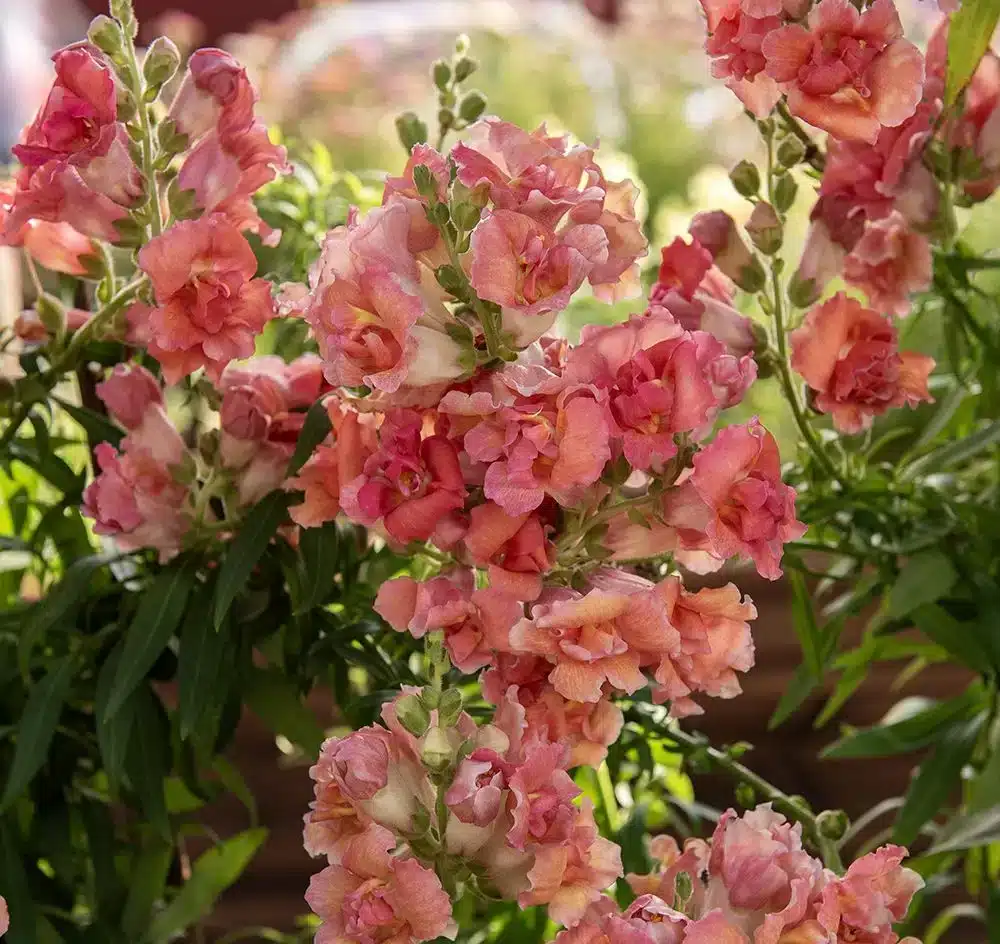 Høj. Unik løvemund med store, fyldige blomster i tætte aks, der troner på lange, kraftige stilke. Behagelige, varme nuancer af koral og abrikos. Perfekt til store buketter og dekorationer. Meget effektfuld i bede og større potter.