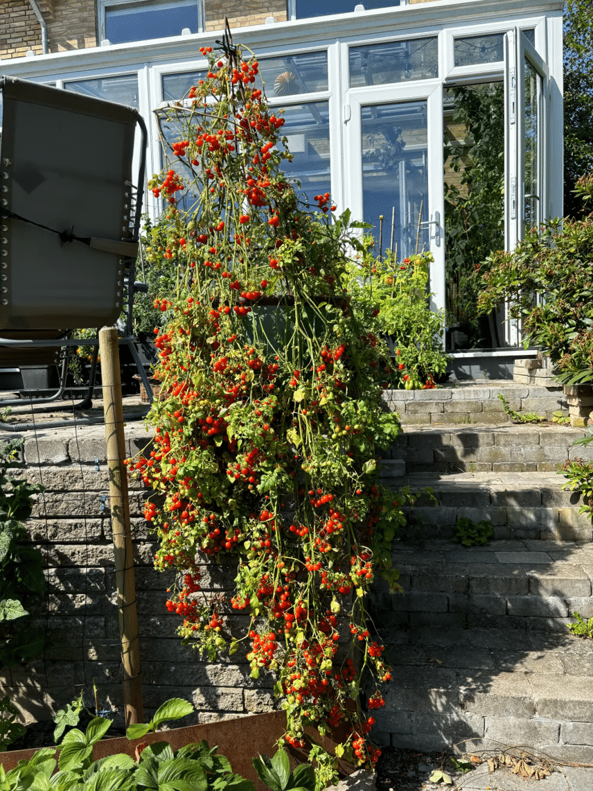 Hvis Micro Cherry sås i en stor potte, kan den blive meget store (der er 3 planter i den potte jeg viser på det første billede). Har man ikke plads til at den kan hænge, kan den evt snos op om et espalier.