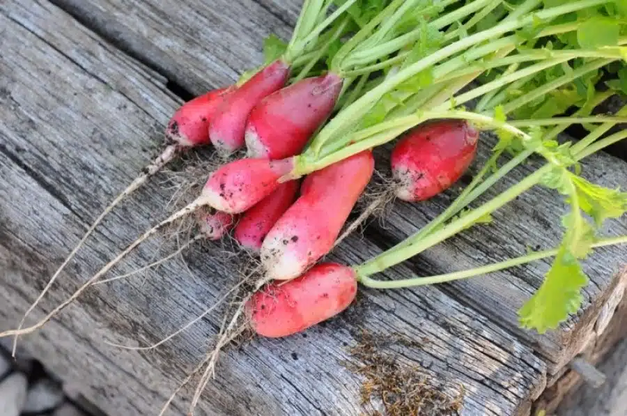 Raphanus sativus (Rädisa-gr.) – Mellemlange, 6-8 cm lange, ensartede, røde rødder med hvid spids, sprød og velsmagende. Hurtigtvoksende og tidlig til frijord og bænk. Kan også drives i drivhus eller bænk i løbet af foråret-vinteren til en tidlig høst.