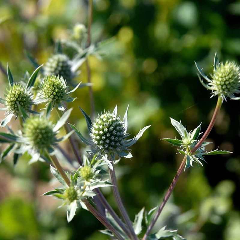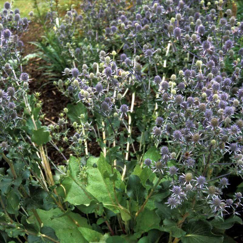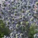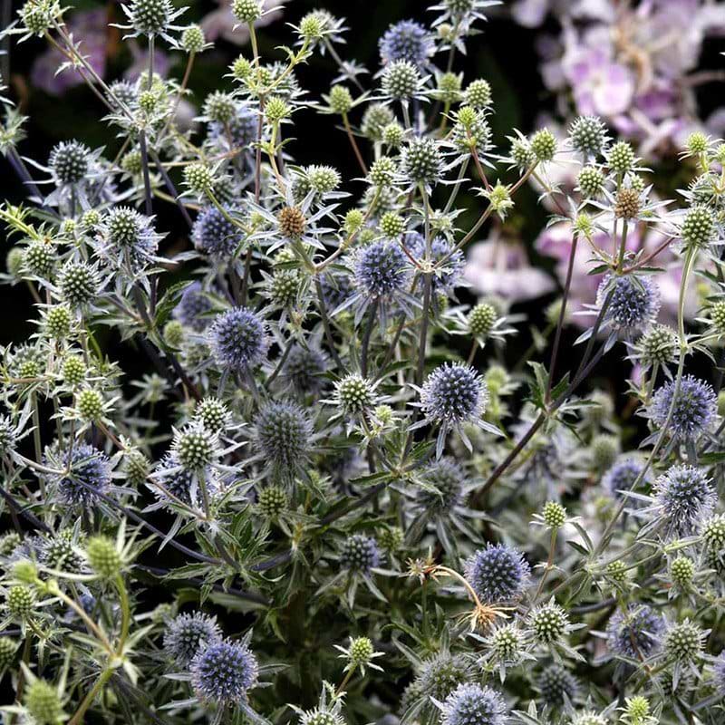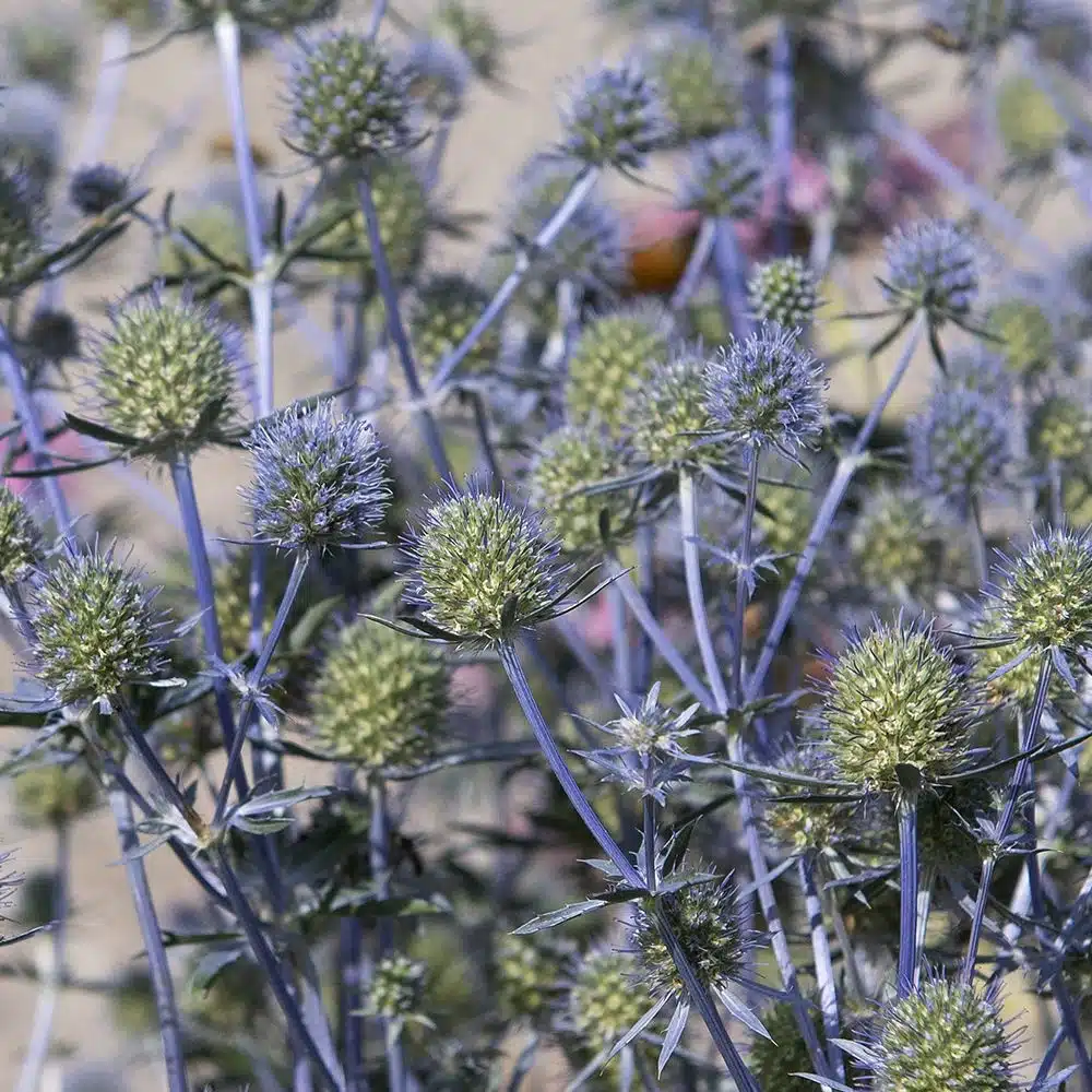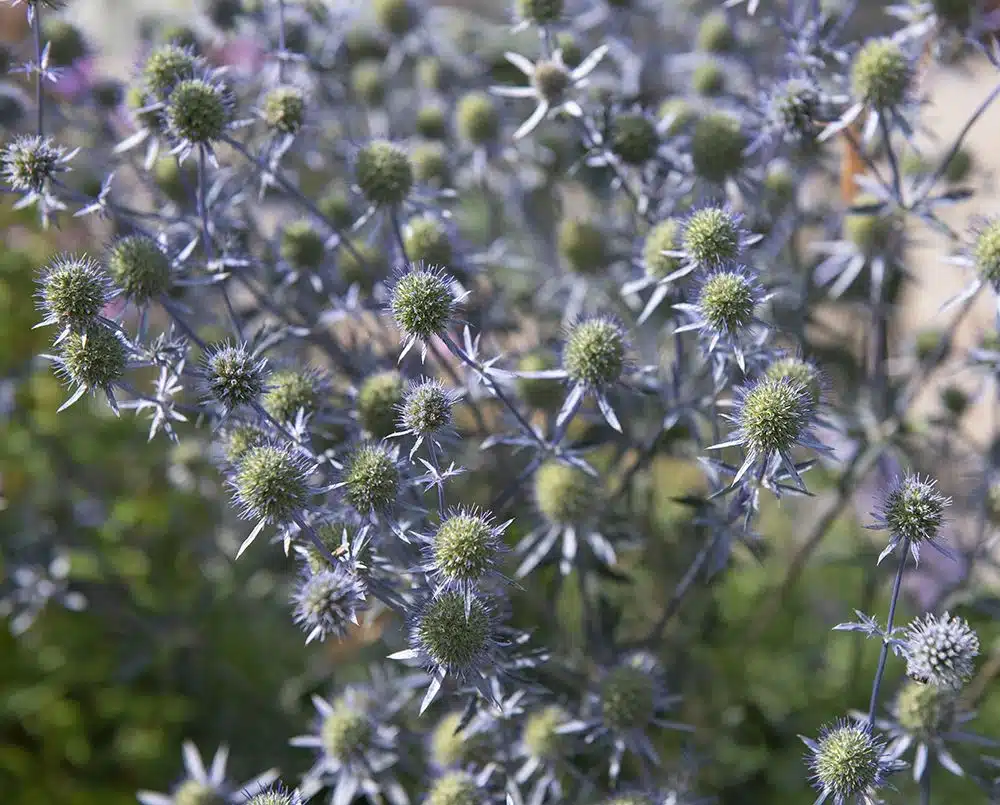 Russisk mandstro, Eryngium planum. flerårig. højde: 100-120 cm. Smuk tidsellignende plante med små stålblå blomster på blå stilke. Russisk mandstro har mange små blomster på hver stilk. En skulturel og dramatisk plante i havens bede. Skøn til brug i buketter, både frisk og tørret. Bevarer farven, hvis den tørres lige når blomsterne er sprunget ud.