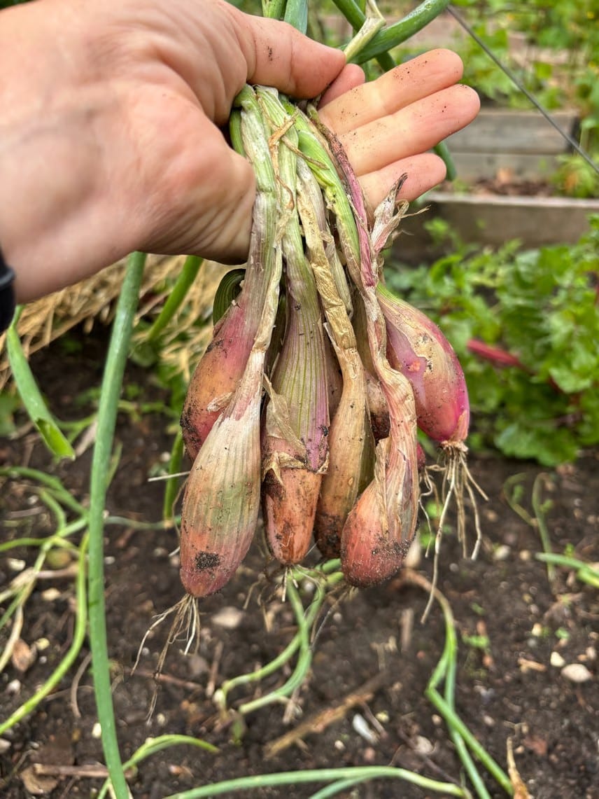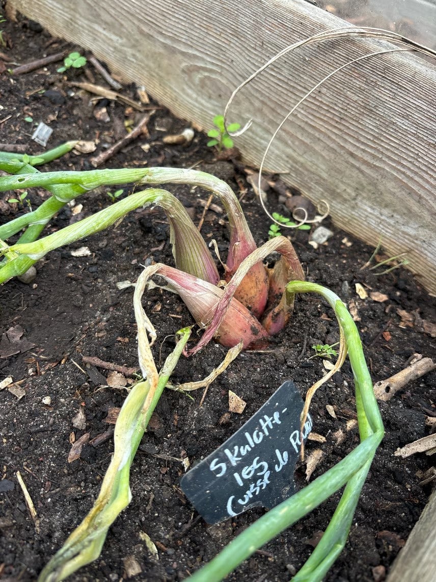 Indtil da kan du dog sagtens høste løbende efterhånden som du skal bruge løg. Hvis du har sat dem i grupper, kan du høste de største løg først. På den måde får du tyndet ud og de tilbageværende løg fortsætter med at vokse – nu med lidt bedre plads.
