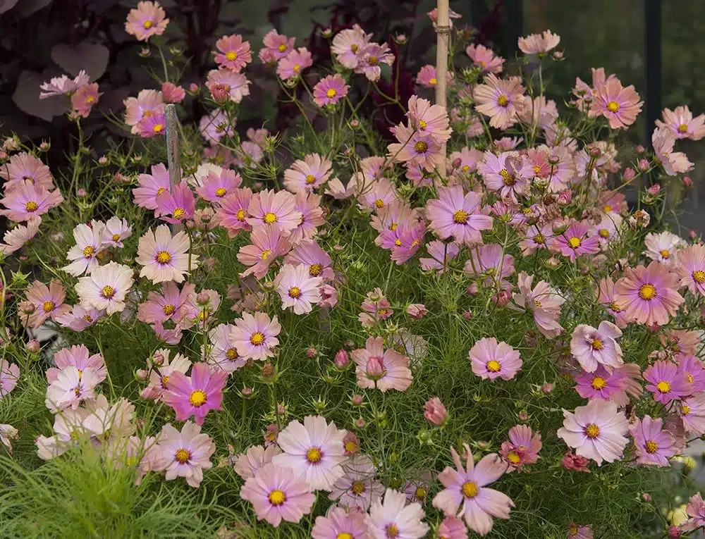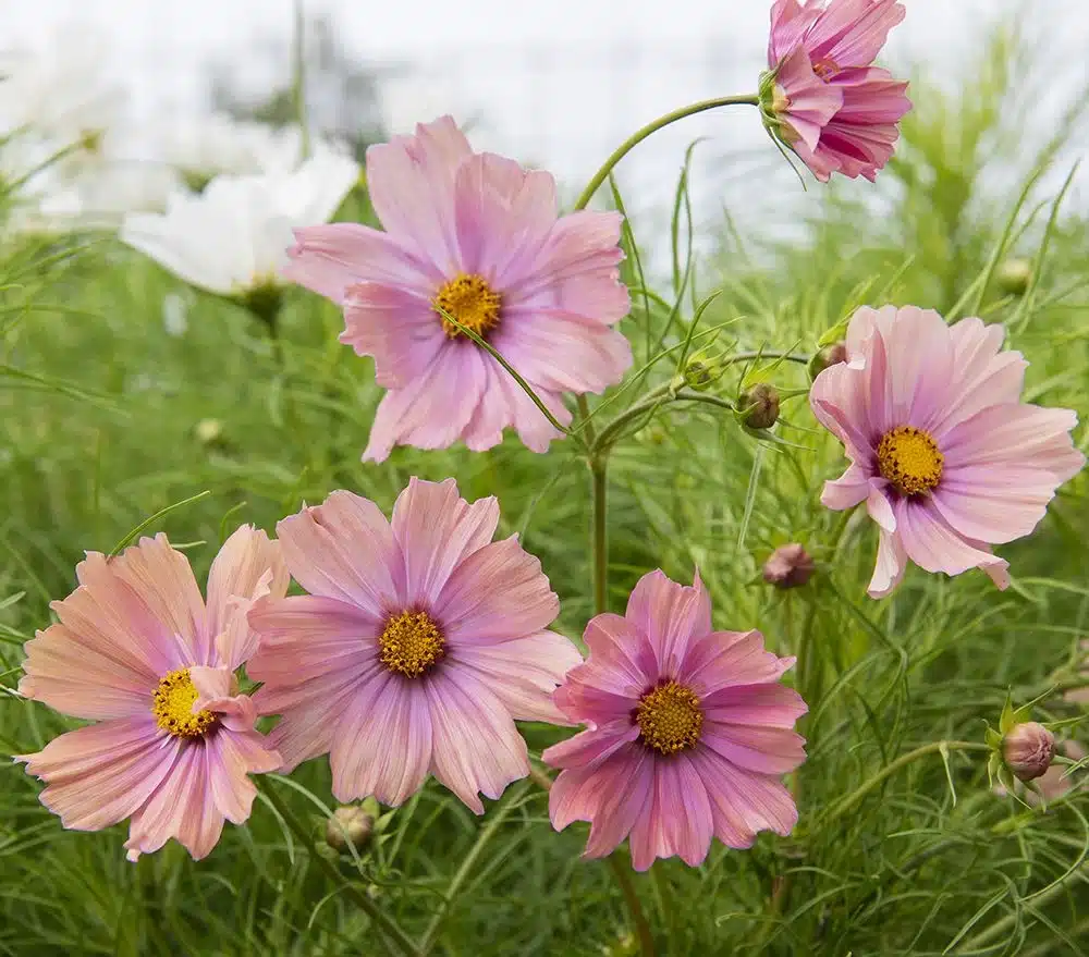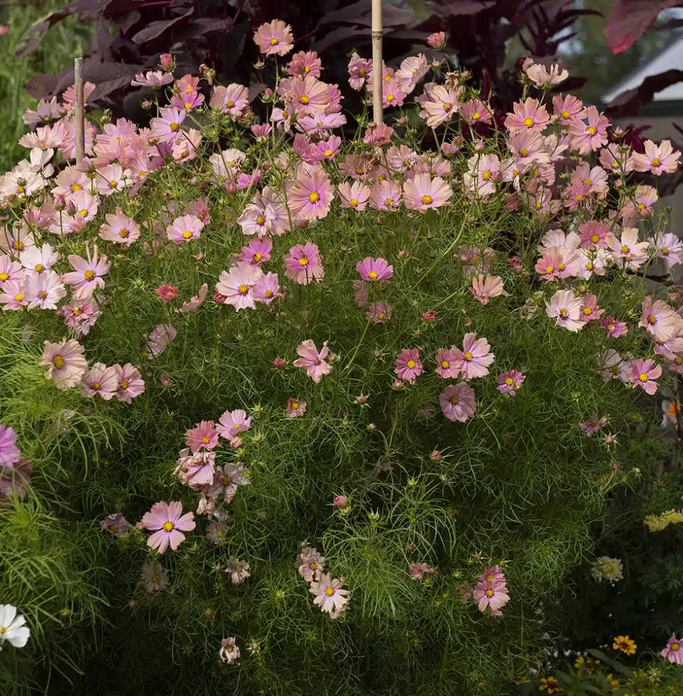 Enkle blomster i en nostalgisk farvekombination, hvor hver blomst skifter fra varm abrikos til blomme og cremet pink. Finfliget, dildlignende blade og busket, velforgrenet vækstform til krukker, blomsterbede og sommerbuketter.