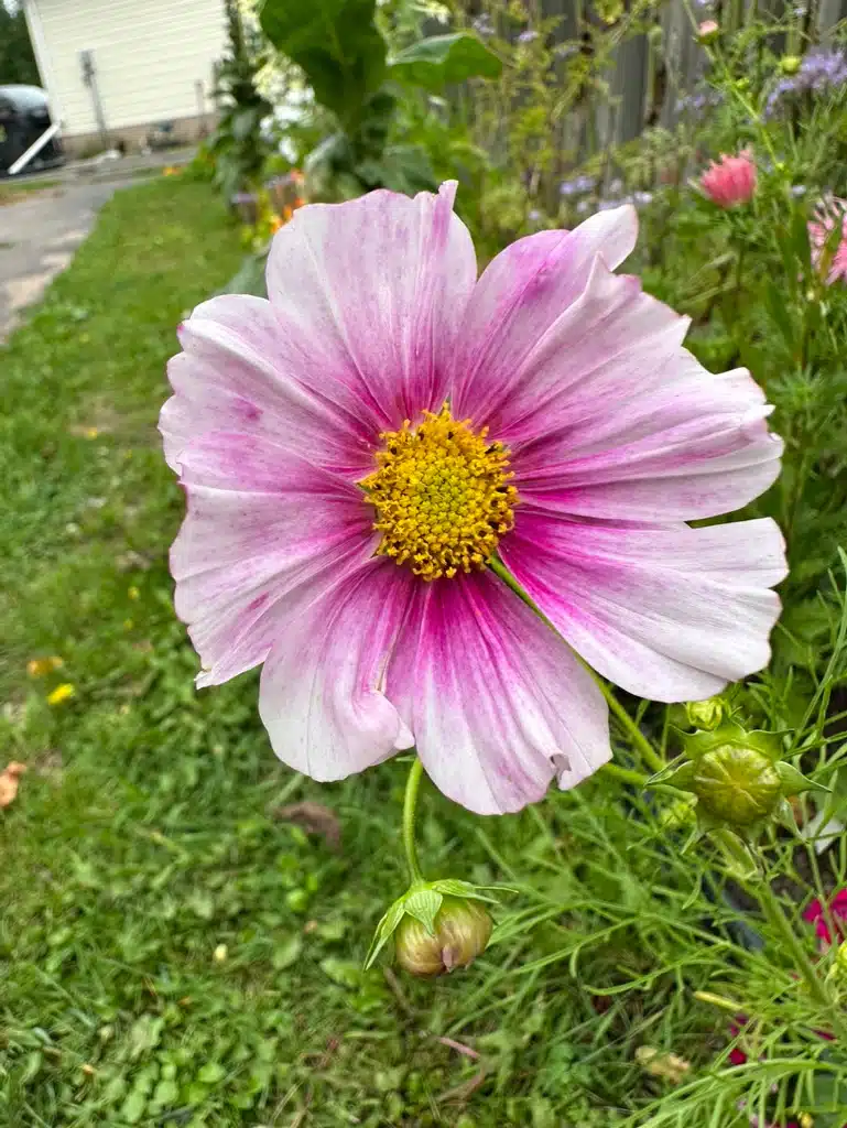 (Cosmos bipinnatus) – Cosmos ‘Daydream’ På dansk stolt kavaler. Farve: Hvid med rosa midte. Blomsten har en diameter på 11 cm! Højde: 100 – 120 cm.